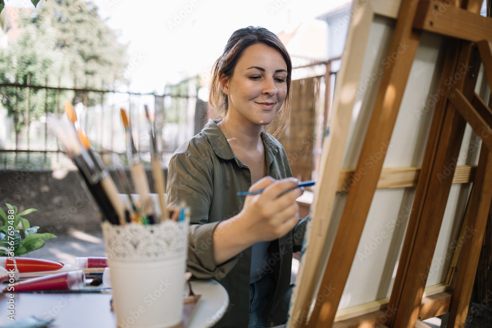 Young female artist enjoying painting in backyard. Beautiful amateur painter drawing picture on canvas using paint brush and oil paint in garden art studio.