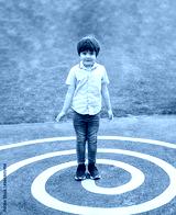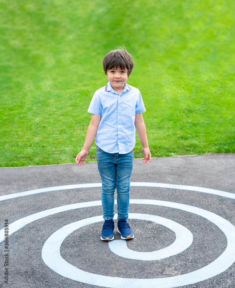 Full lenght portrait kid standing on circle line at asphalt, Active kid playing in green field at the park , Child play and learn outdoor activity con spring or summer