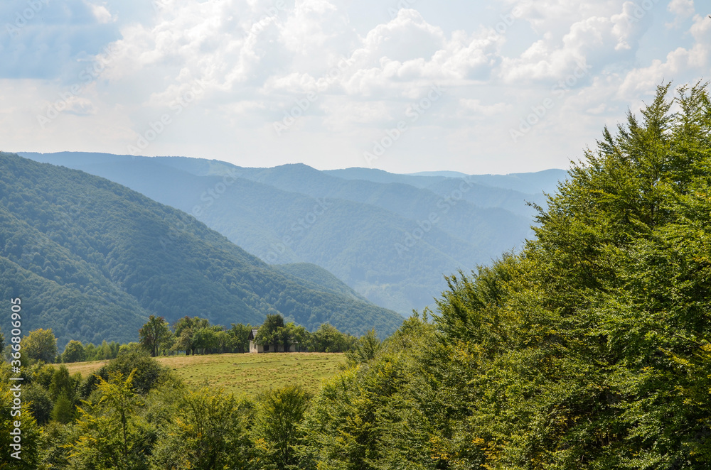 Ruins of house in the abandoned village Kosiv Verkh against beautiful Carpathian landscape vith high mountains and green forest