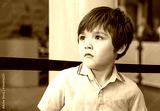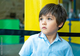 Candid shot kid looking up with chock face, Head shot child looking deep in through, Young boy with curiouse face standing alone with blurry school background.