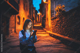 tourist girl using mobile phone with glasses reflection of screen light of street old historical city at night, woman plans walk architectural sights of old town looks at online map in cellphone