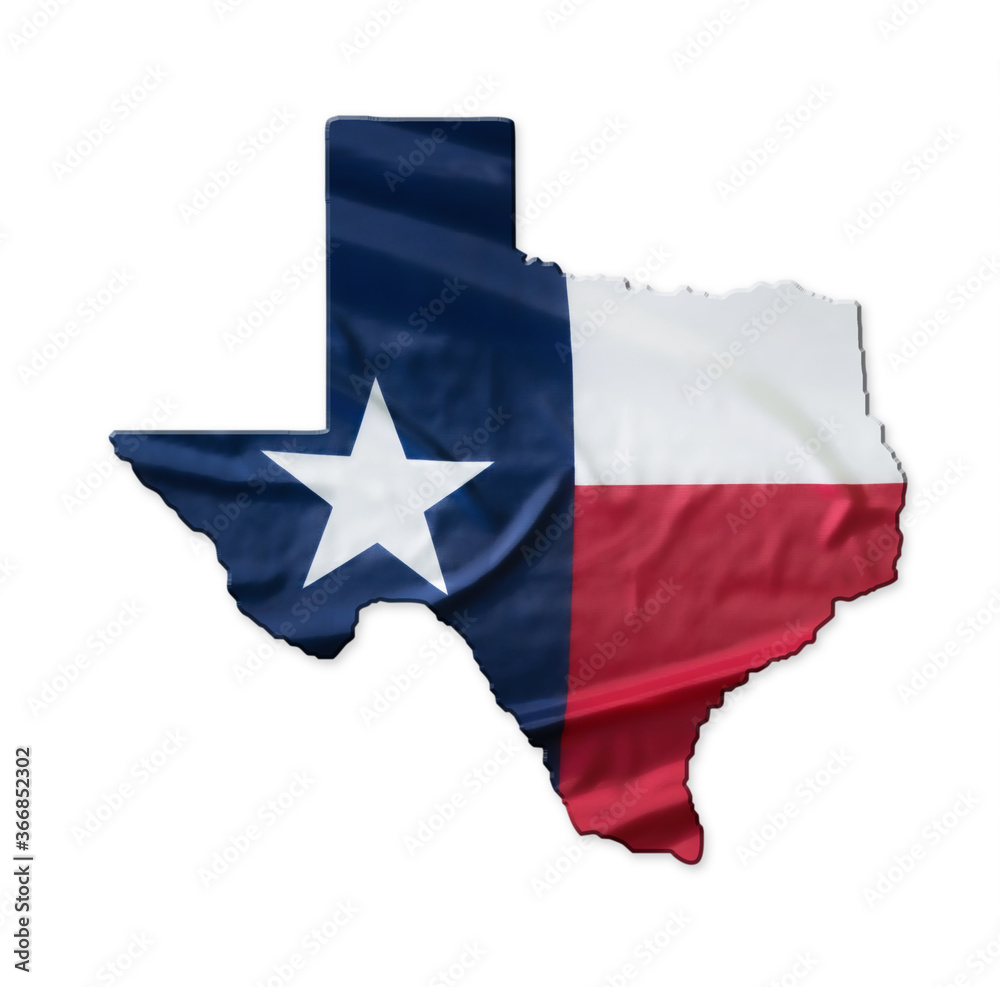 Texas flag waving fabric texture on the state map outline. Isolated on white background.