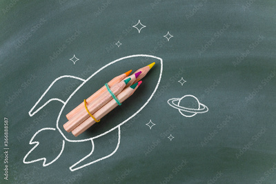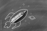 Drawing of a rocket with pencils on blackboard