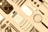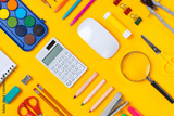 School supplies flat lay on yellow background