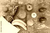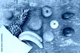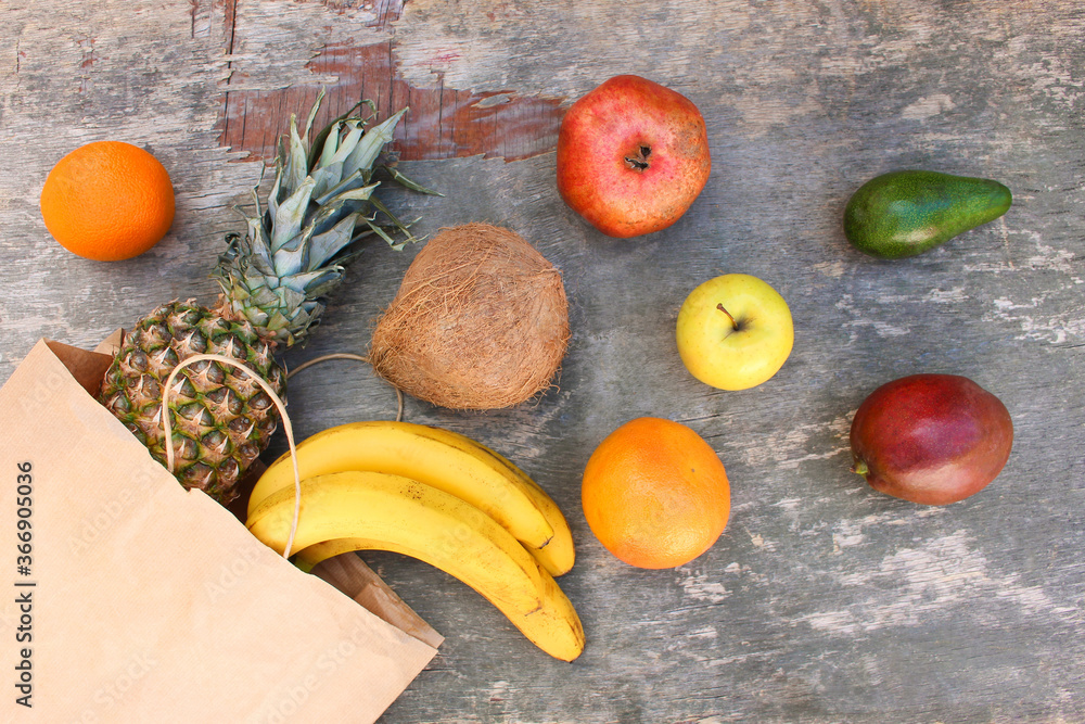 Paper bag with fruits and vegetables on old wooden background. Top view.