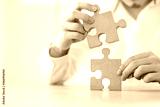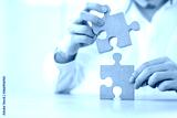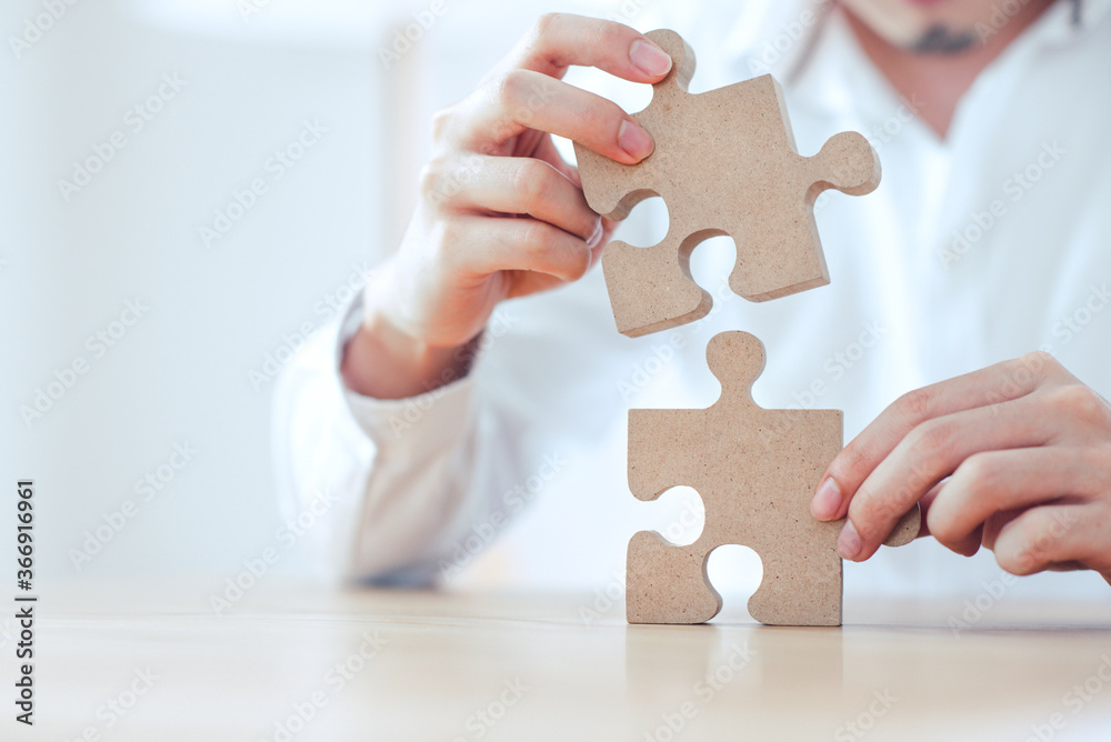 Business solutions partnership and strategy concept, Businessman hand connecting jigsaw puzzle on desk.