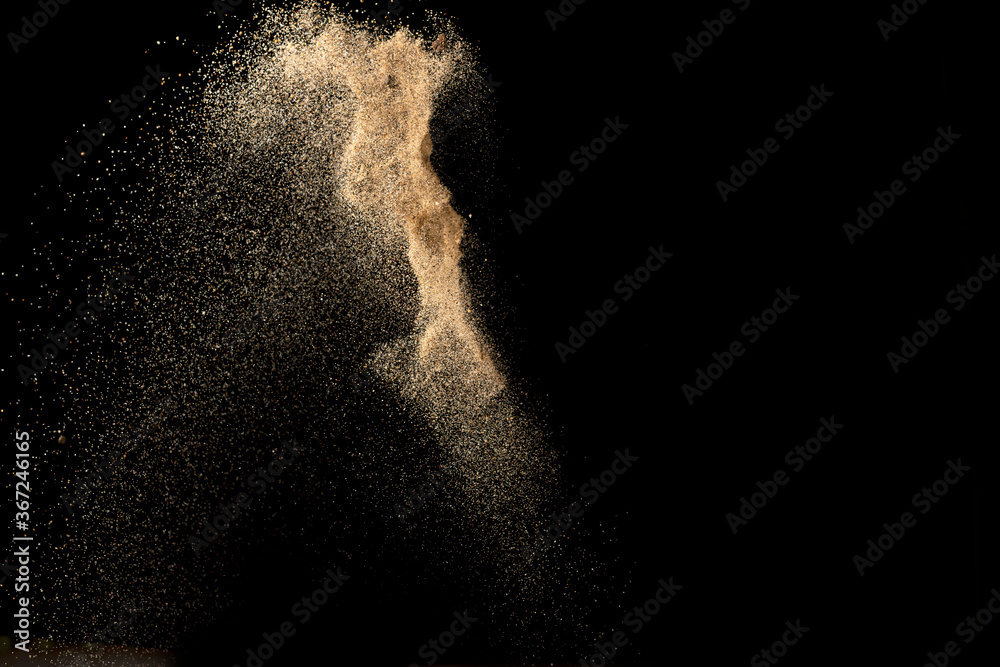 Gold sand explosion isolated on black background. Abstract sand cloud.