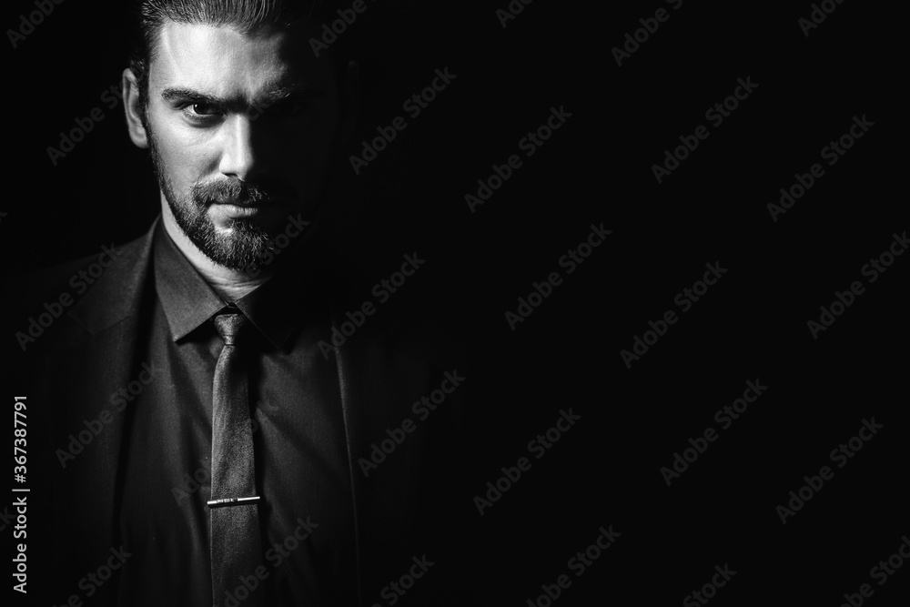Portrait of a white Caucasian male brunet in a black classic suit, black shirt and black tie over a black background. Fashionable portrait of an attractive man with dark hair.