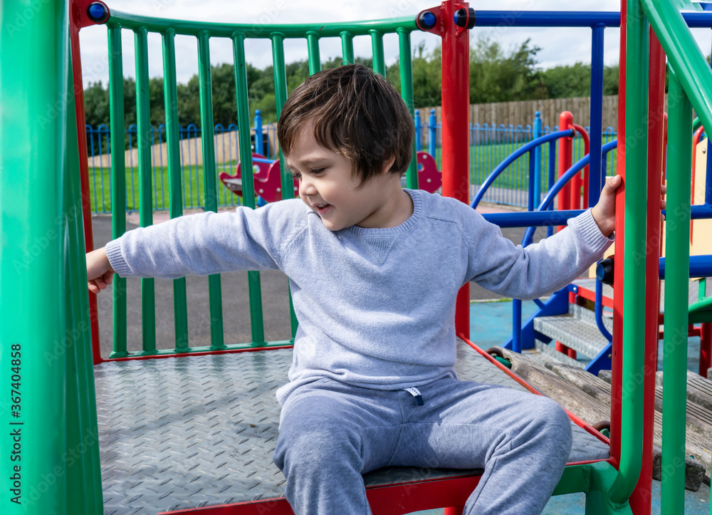 Portrait Cute litte boy playing alone in playground, Candid Child pointing finger and looking down, Toddler boy playing in school outdoors area in sunny day summer