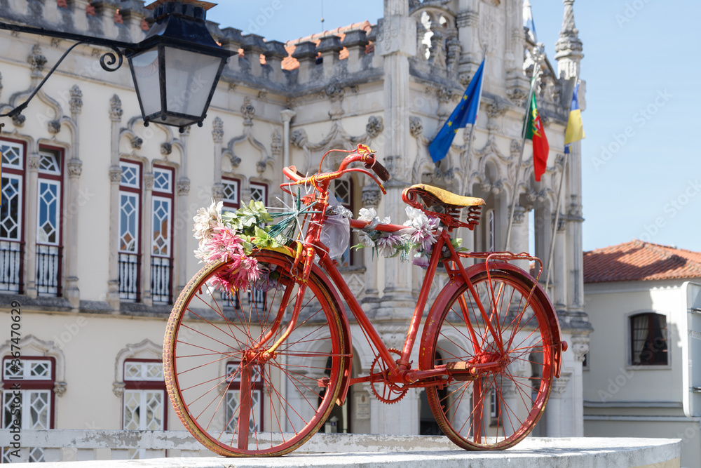 Sintra / Portugal. Old bicycle decorated with flowers on the square in front of the Town Hall in Sintra, Portugal.