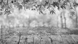 Wooden table with orange leaves autumn background