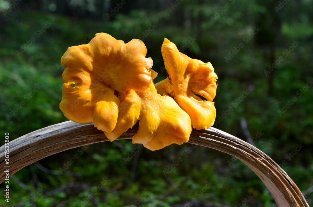 Fresh edible chanterelle mushrooms on wicker rustic basket on green moss in the Forest