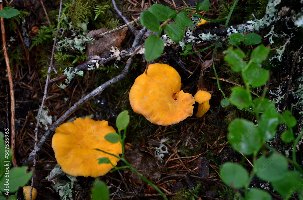 Yellow edible chanterelle mushrooms in a forest at autumn