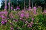 Blooming Willow herb in the forest on a sunny summer day, Ivan tea blooms with purple flowers