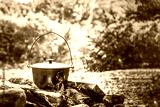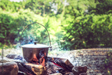 Traveling, tourism, picnic cooking, cooking in a cauldron on the fire, boiling pot at the campfire on picnic.