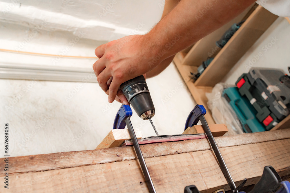 Male carpenter working on old wood in a retro vintage workshop.
