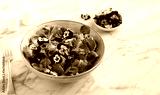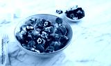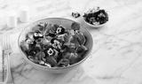 Fresh green salad with strawberries and edible flowers in a bowl. Marble background. Copy space.