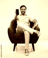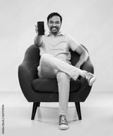 people, technology and furniture concept - happy smiling young indian man showing smartphone sitting in chair over grey background
