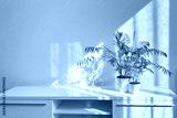 Stylish interior desk with green houseplants and shadows on the wall.