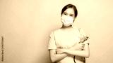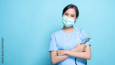 Asian Thai nurse or doctor wearing mask and holding stethoscope with big smiled isolated in studio on blue background