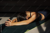 Young sportive attractive woman in sportswear, doing yoga, doing breathing exercises, relaxation pose, workout at home. The shadows from the sun on the girl's body. Copy space.