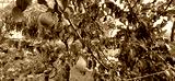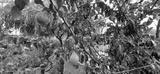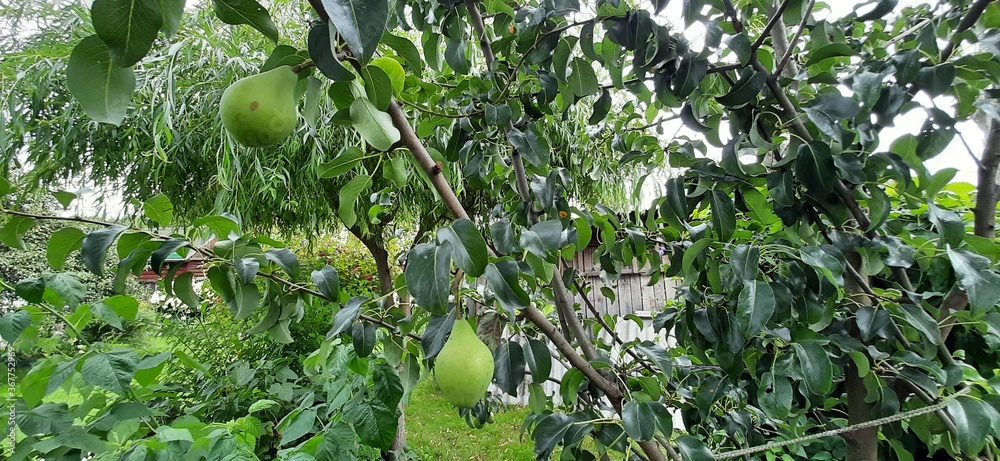 unripe green pear on tree branch