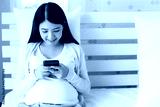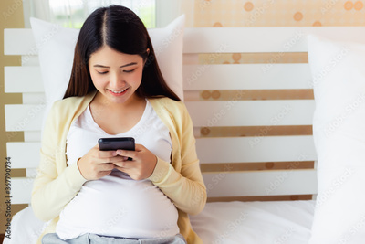 Happy young asian pregnant woman using and browsing online information of prenatal care on smartphone. Pregnancy mother sitting on bed at home. pregnancy, motherhood, people, technology concept