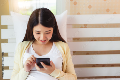 Happy young asian woman using smart phone for online shopping, financial, transfer money, internet banking, searching information, chatting with friend, text messaging on bed at bedroom with smile