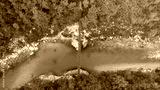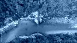 Aerial view of the turquoise blue Soca river (Isonzo) and wooden bridge near Bovec in the Julian Alps