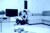 Happy sportswoman using smart phone after a workout at home. Woman goes in for sports at home. Sport break. She sitting on floor at home Empty space.