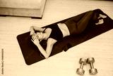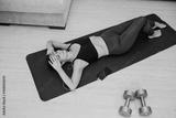 Tired sports woman in sportswear taking a rest after hard work out, wipes sweat from forehead and lying on fitness mat with eyes closed on floor.Concept of exercise at home with basic sports equipment