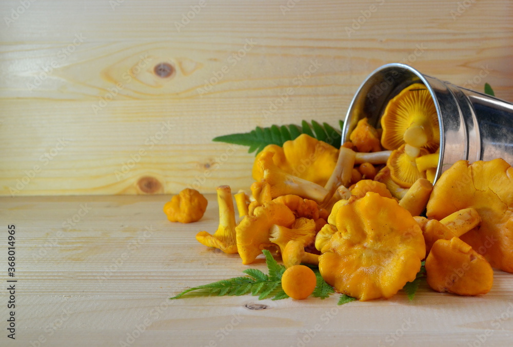 Yellow edible mushrooms chanterelle (cantharellus cibarius) on metalbasket with green fern on natural light wooden background