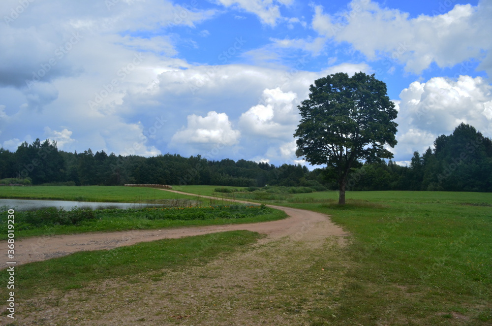 Landscape with a dirt road and a big maple tree in the blue sky