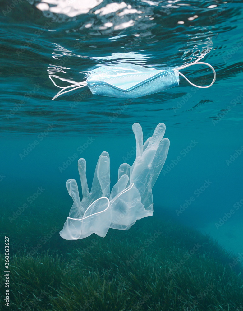 Gloves underwater and face mask floating on water surface, plastic waste pollution in the sea, coronavirus COVID-19 pandemic, Mediterranean sea