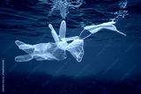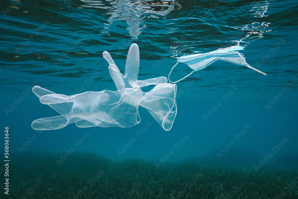 Gloves and face mask underwater in the sea, plastic waste pollution since coronavirus COVID-19 pandemic, Mediterranean sea