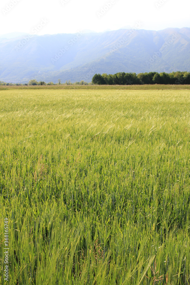 Green wheat plants growing in the field against mountains on a sunny summer day. Wheat cutlivation in northern Italy