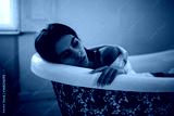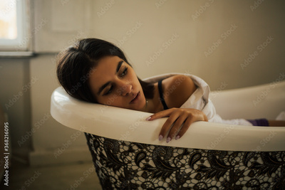 Portrait of serene woman on side of bath while resting there. Calm lady having leisure during spa procedure.