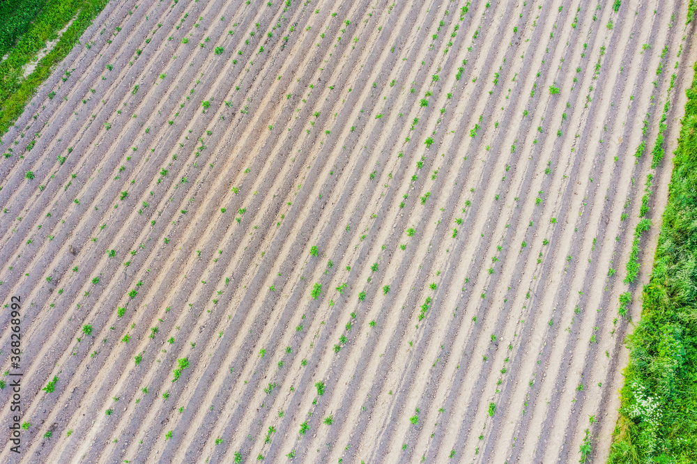 Spudding soil around agricultural vegetable plants ridges row, aerial top view.
