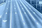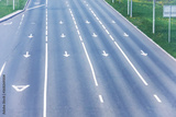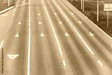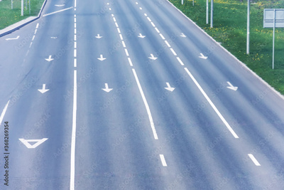 Four paved lanes with traffic arrows directing traffic in various directions, dedicated bus lane.