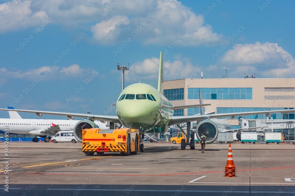 Towing the aircraft from the boarding bridge to the apron before departure.