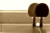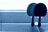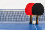 Black and red table tennis racket and a white ball on the blue ping pong table with a net, Two table tennis paddle is a sports competition equipment indoor activity and exercise for background concept