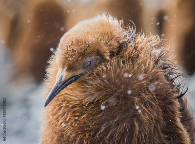 Young, king penguin, called oakum boy, shakes off snow falling.