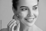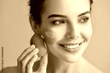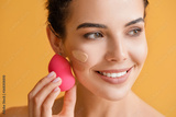 Beautiful young woman with foundation on her face against color background