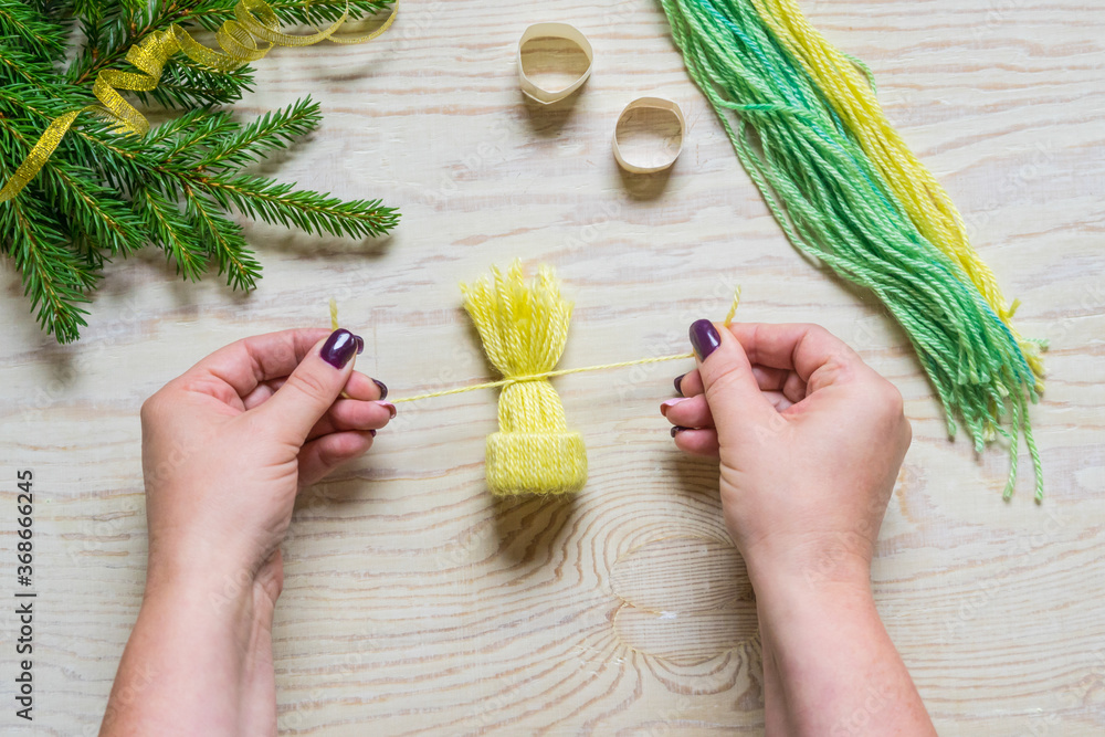 DIY winter craft, small beanie. Step 7: Tighten the knot on the bundle of threads, form a hat.