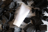 White cosmetic tube and natural black charcoal. Skin care concept. Creative layout with copy space.