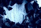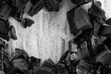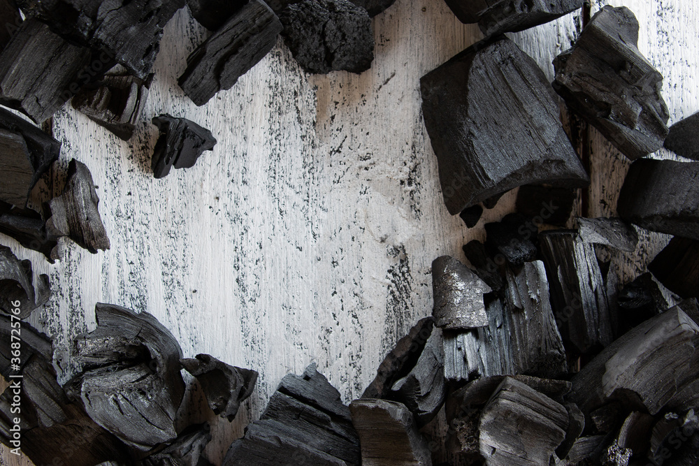 A pile of black coal in the form of a frame for text on a light wooden background. Skin care concept. Creative layout.