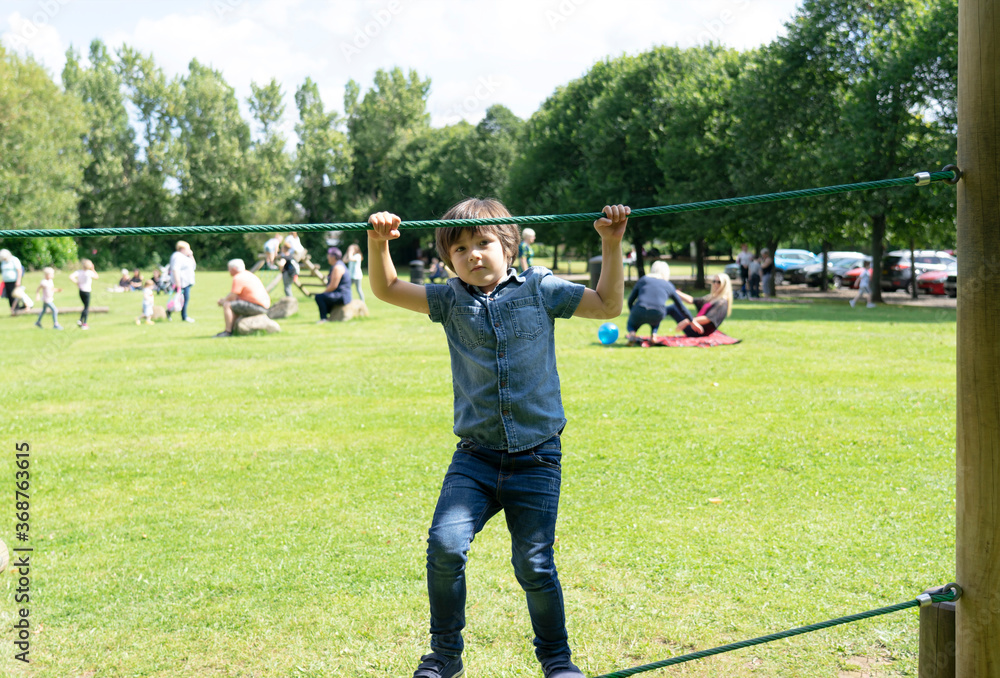Active kid holding robe in playground, Child enjoying activity in a climbing adventure park on summer sunny day, Cute little boy having fun on a playground outdoors.