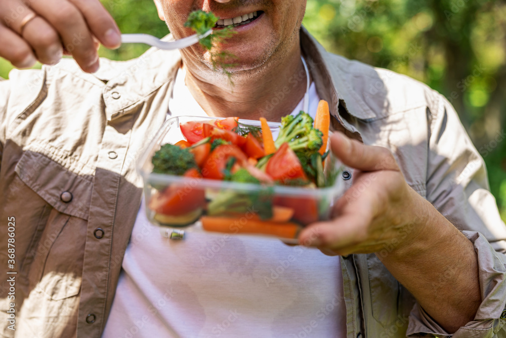 Close-up of a young man eating a fresh vegetable salad, shallow depth of field, selective focus. Healthy food concept