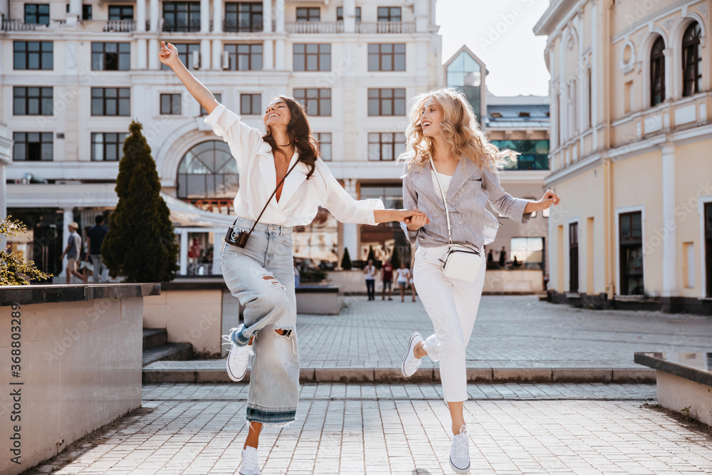 Full-length portrait of carefree smiling girls running down the street. Outdoor photo of lovely white young ladies spending weekend together.