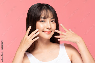 Young Beautiful Asian woman smile touching soft cheek with clean and fresh skin Happiness and cheerful with positive emotional,isolated on pink background,Beauty Cosmetics and spa Treatment Concept